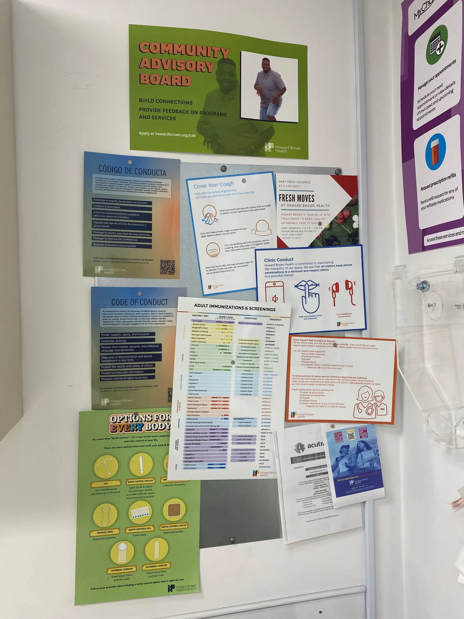 • A chart titled 'Adult Immunizations & Screenings' listing various vaccines and tests, target ages, conditions, and frequency recommendations. Categories include general health, cancer, sexual health, prevention, nutrition, immunizations, and COVID. Each item is color-coded. The chart is branded with Howard Brown Health logo and hangs against an orange wall.